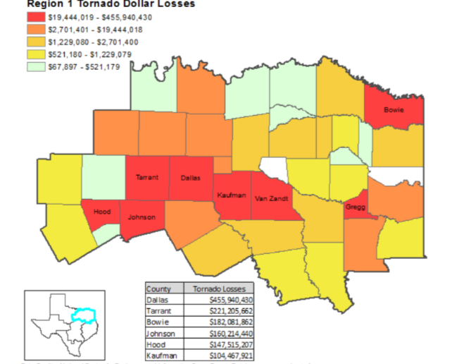 In de afbeelding hier rechts, kunnen we zien in welke regio's de tornado's de meeste schade hebben aangericht. Regio 1 heeft de meeste schade moeten ondergaan en dus ook de meeste economische gevolgen. Waco ligt dichtbij Dallas en dus ook in regio 1.