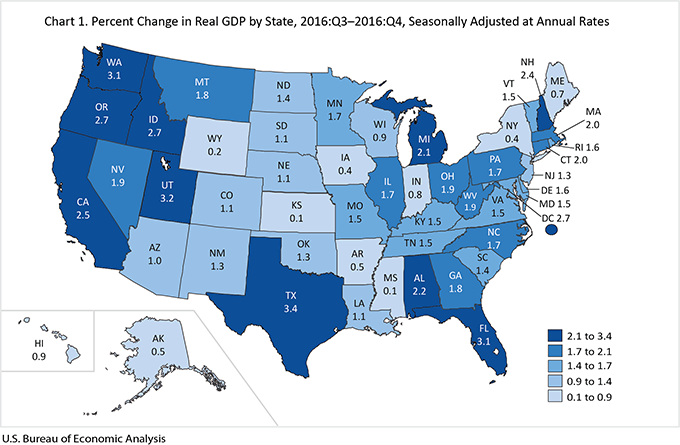 Op deze kaart is te zien dat Wyoming als slechtste staat presteert op het gebied van economische prestaties, de economie krimpt met 1,2%. Dit zou een gevolg kunnen zijn van de kosten van overstromingen, achtergebleven infrastructuur of migratie van geschoolde arbeidskrachten.